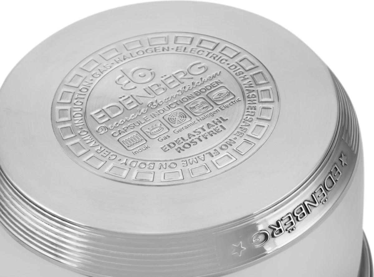 Prachtige 12-delige pannenset van hoge kwaliteit. Een set gemaakt van hoogwaardig roestvrij staal. Product gerenommeerde merk Edënbërg . Dankzij de speciale bodem wordt de warmte snel verdeeld, waardoor je energie bespaart. In de pan zit een praktische maataanduiding voor gebruiksgemak.