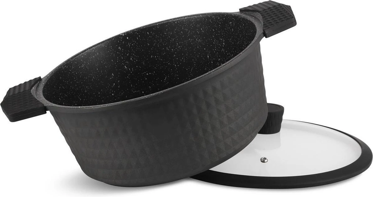 - Kookpan met glazen deksel: inhoud 6.44 liter, diameter 28 cm