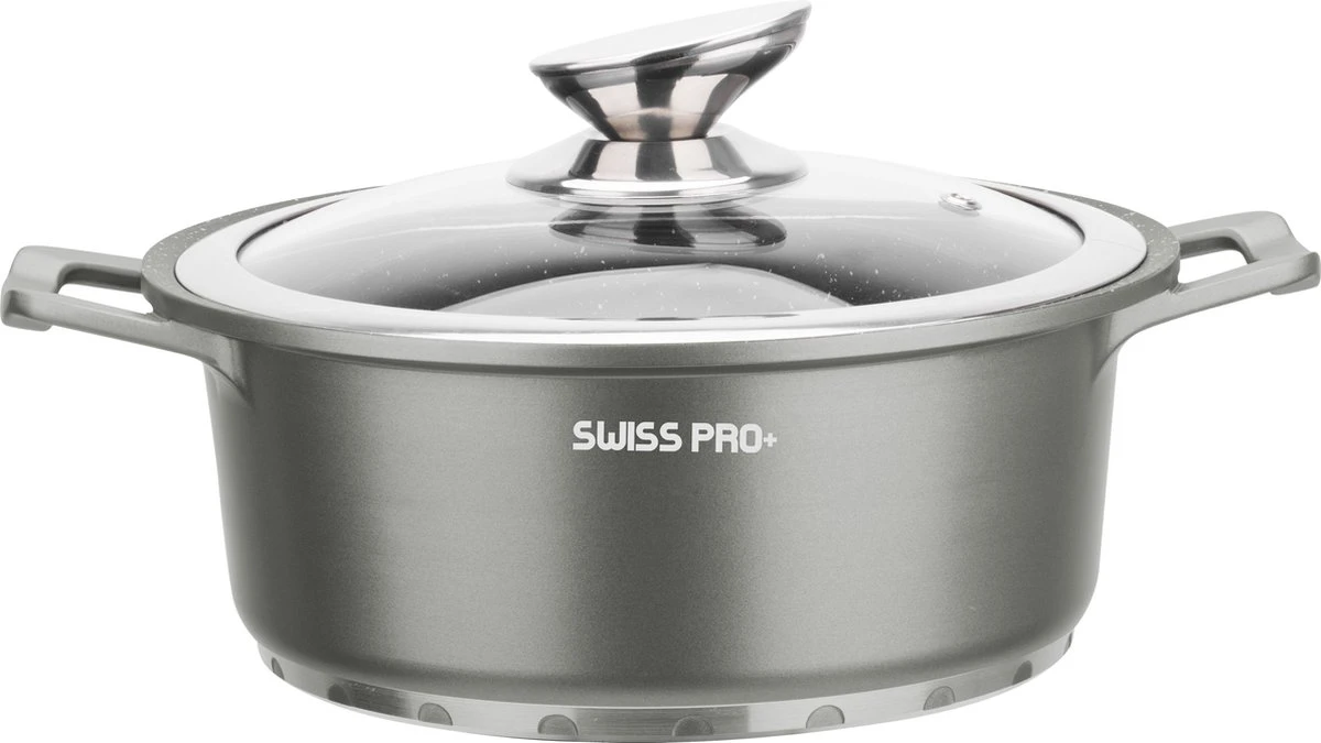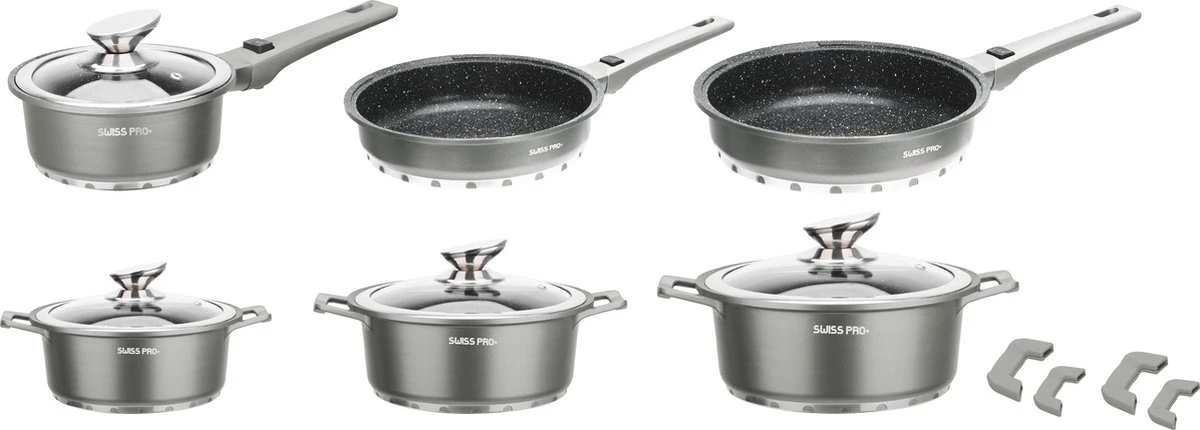 Swiss Pro+ | Set 14 Delige Pannenset | Inductie – Pannensets – Glazen Deksel – Met Afneembare Handgreep – Marmeren Interieur -PFAS-vrij | Grey / Silver